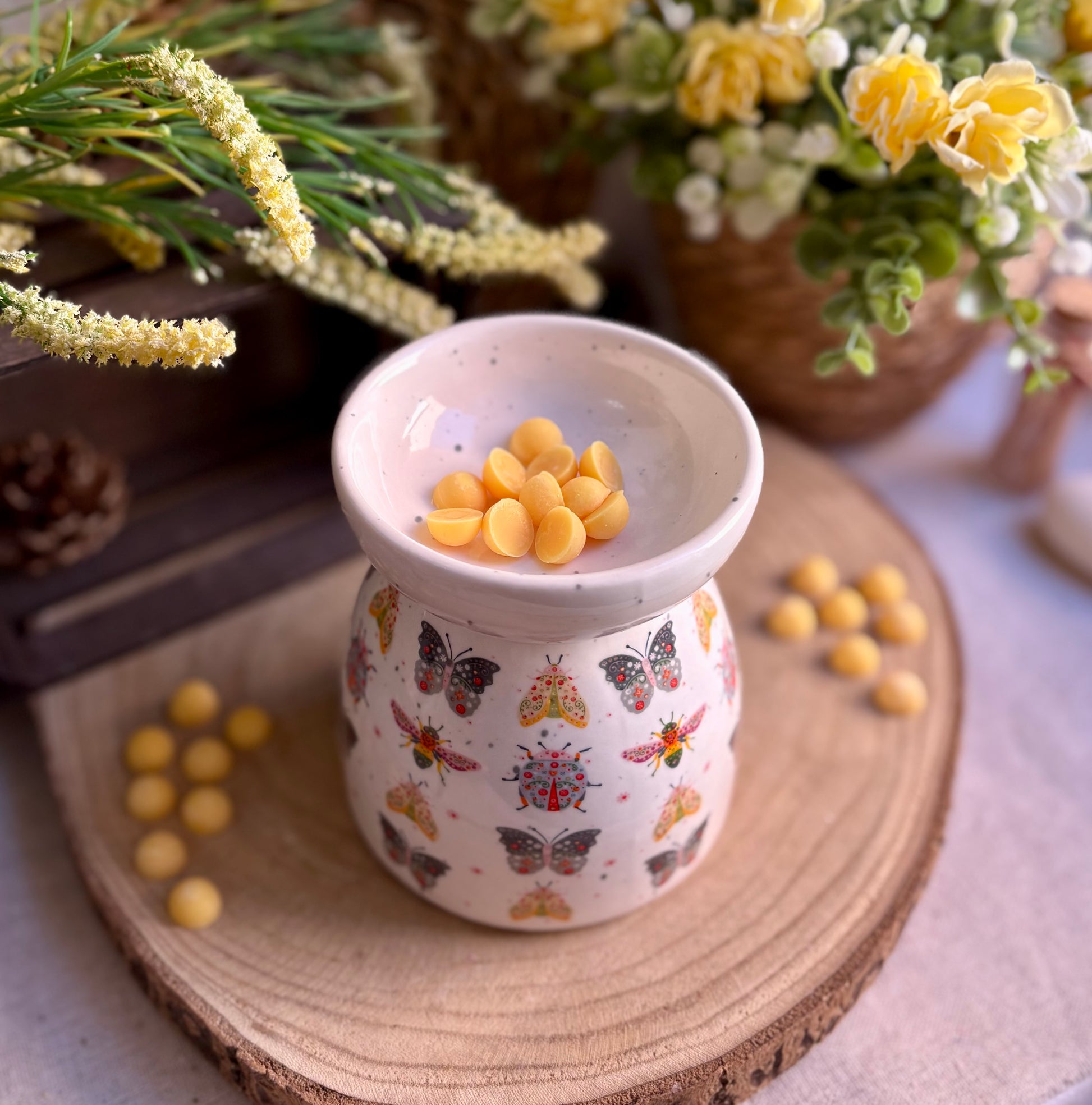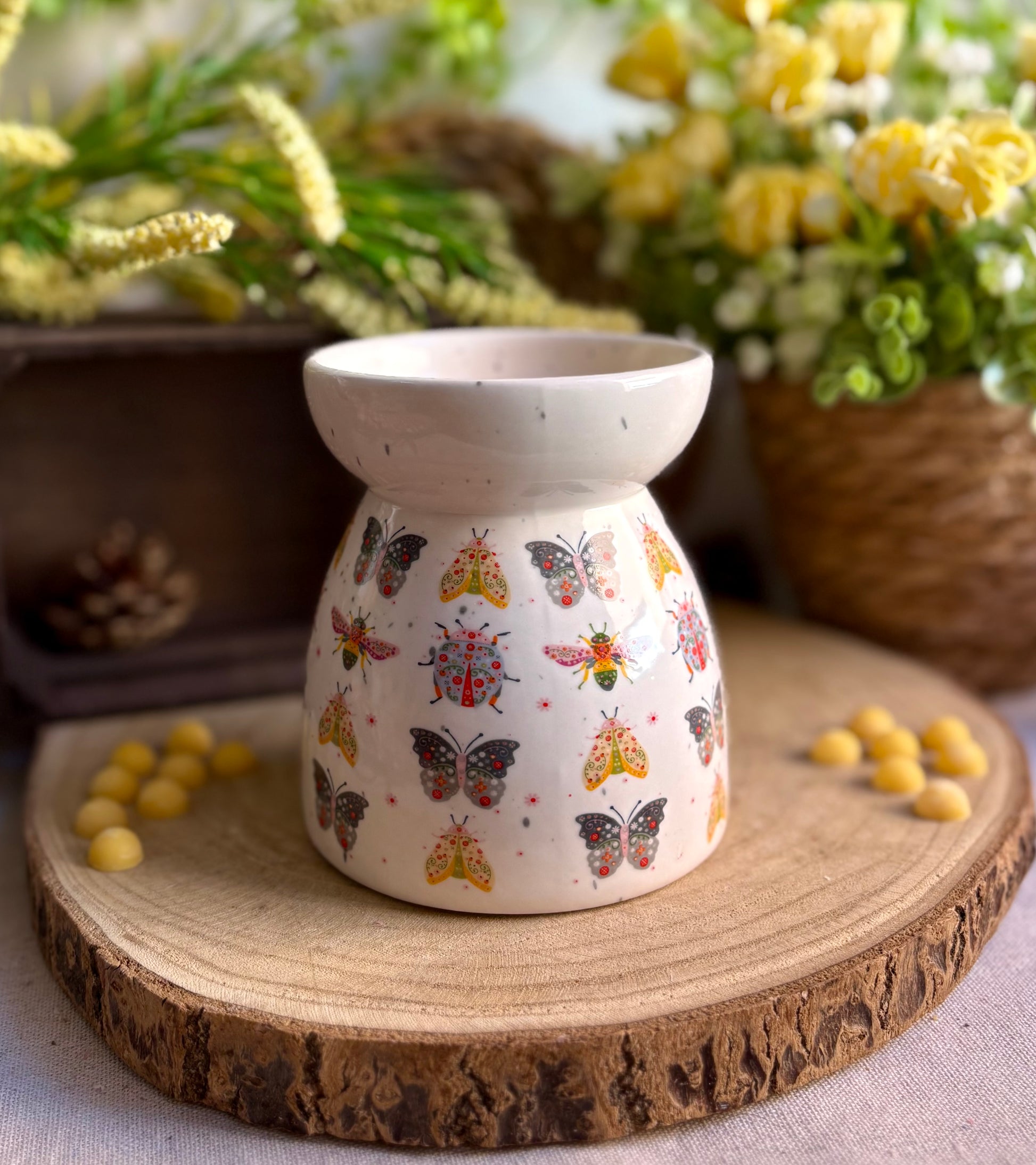 Disfruta derritiendo nuestros wax melts o figuras de cera aromáticas en este quemador de cerámica con dibujos de insectos primaverales 🐞🌼.