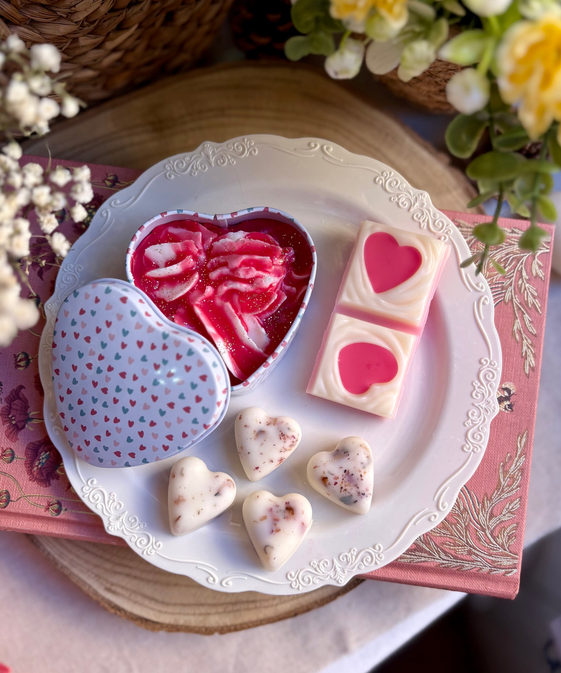 Cuatro corazones aromáticos con un delicado aroma a rosa antigua, decorados con pétalos de rosa naturales, que aportan ese toque elegante, suave y reconfortante que equilibra el conjunto.