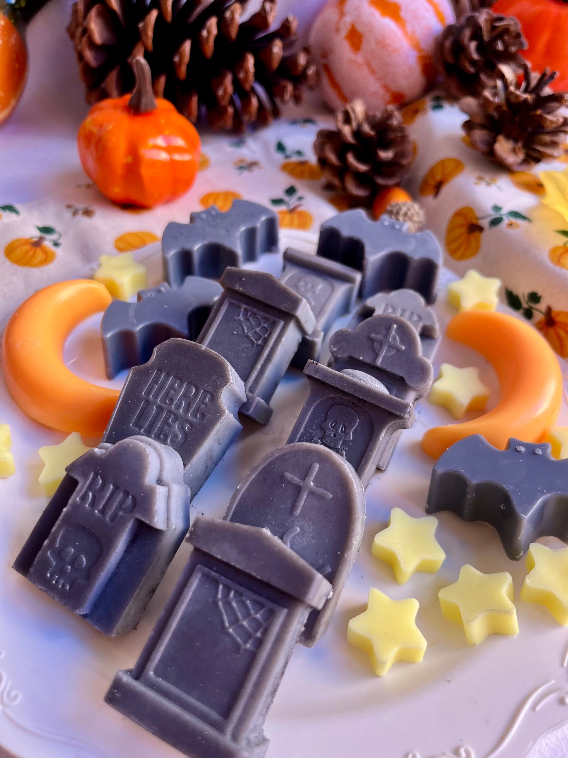 Cuando cae la medianoche y la niebla cubre el cementerio, las lápidas, murciélagos, lunas y estrellas de este pack despiertan su magia aromática. 🌙🦇 Una mezcla hipnótica de manzana y flores que transforma el terror en placer y hace que incluso los fantasmas suspiren de gusto. ✨👻. Un pack de pura magia nocturna para encender la chispa más encantada (y perfumada) de Halloween.