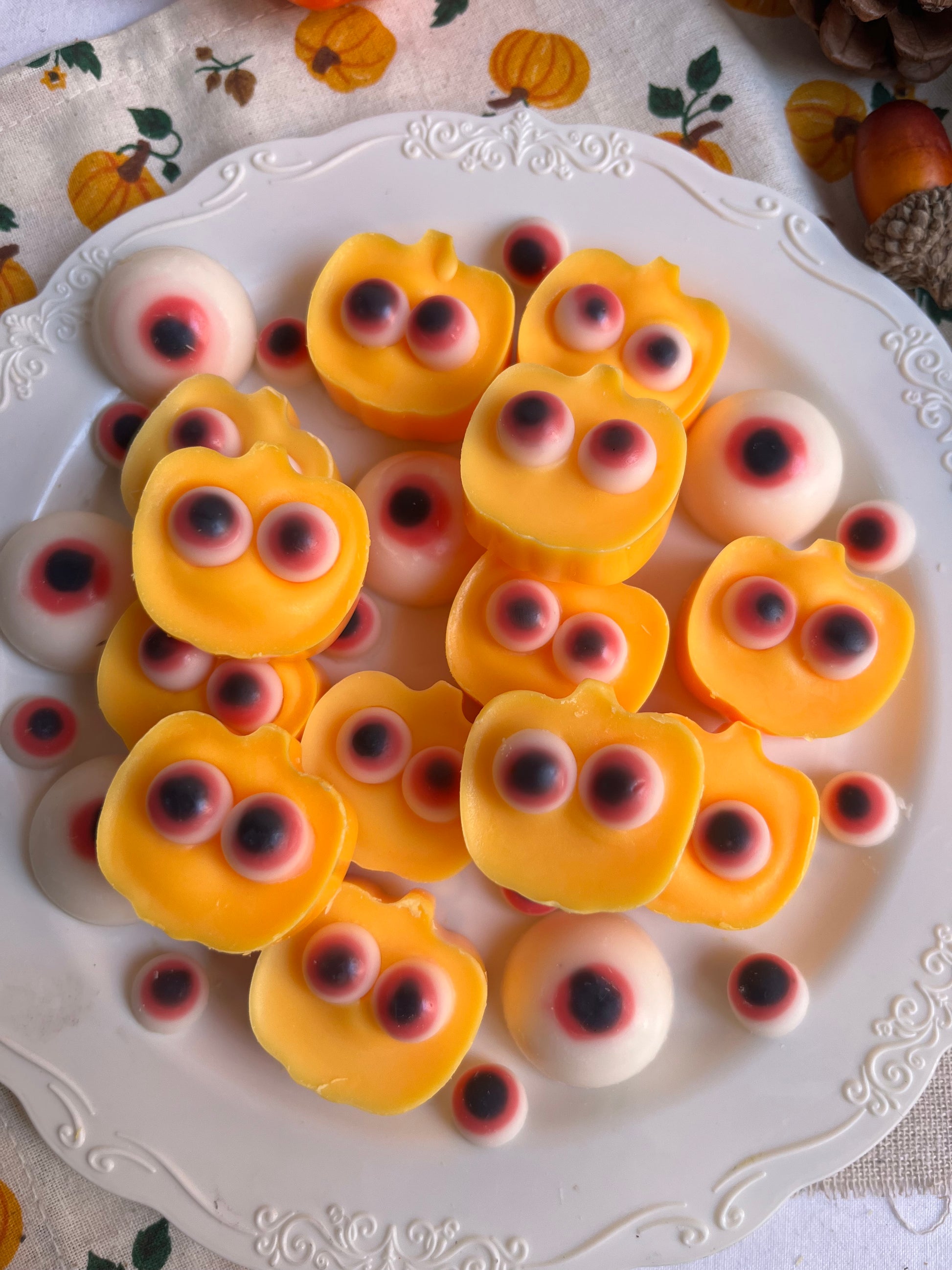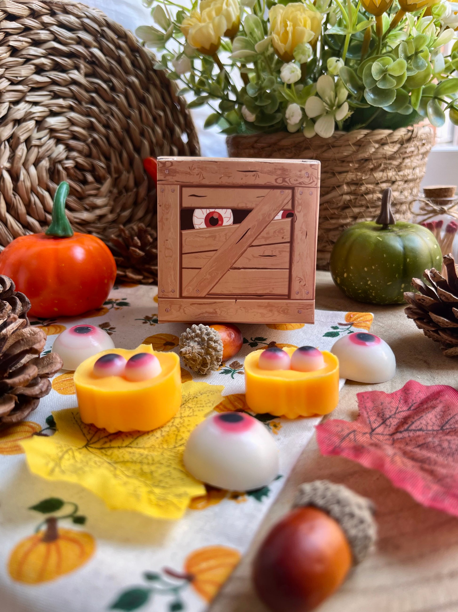 Este pack de wax melts presenta un delicioso aroma a golosinas de frutas y te transporta directo a esas noches de “Truco o trato” llenas de risas y caramelos. Incluye calabazas con ojos saltones y ojitos curiosos que parecen vigilar cada movimiento… pero solo para asegurarse de que disfrutes cada aroma. 😜🎃 Un pack tan divertido como delicioso —perfecto para los más golosos del reino de Halloween. 👁️✨