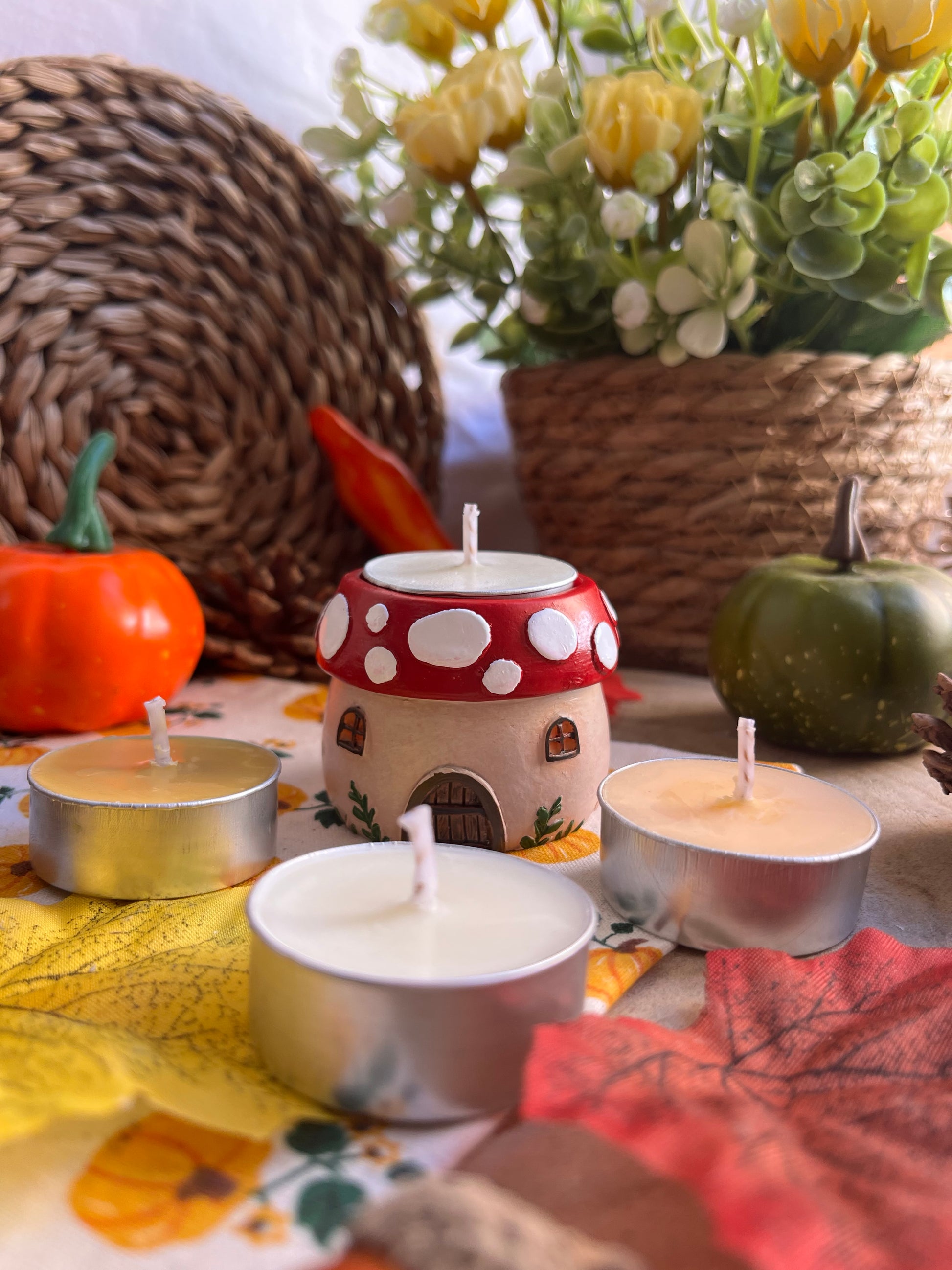 El pack incluye un portavelas de cerámica con forma de casita de seta y 6 velas de té aromáticas empaquetadas en una cajita otoñal.