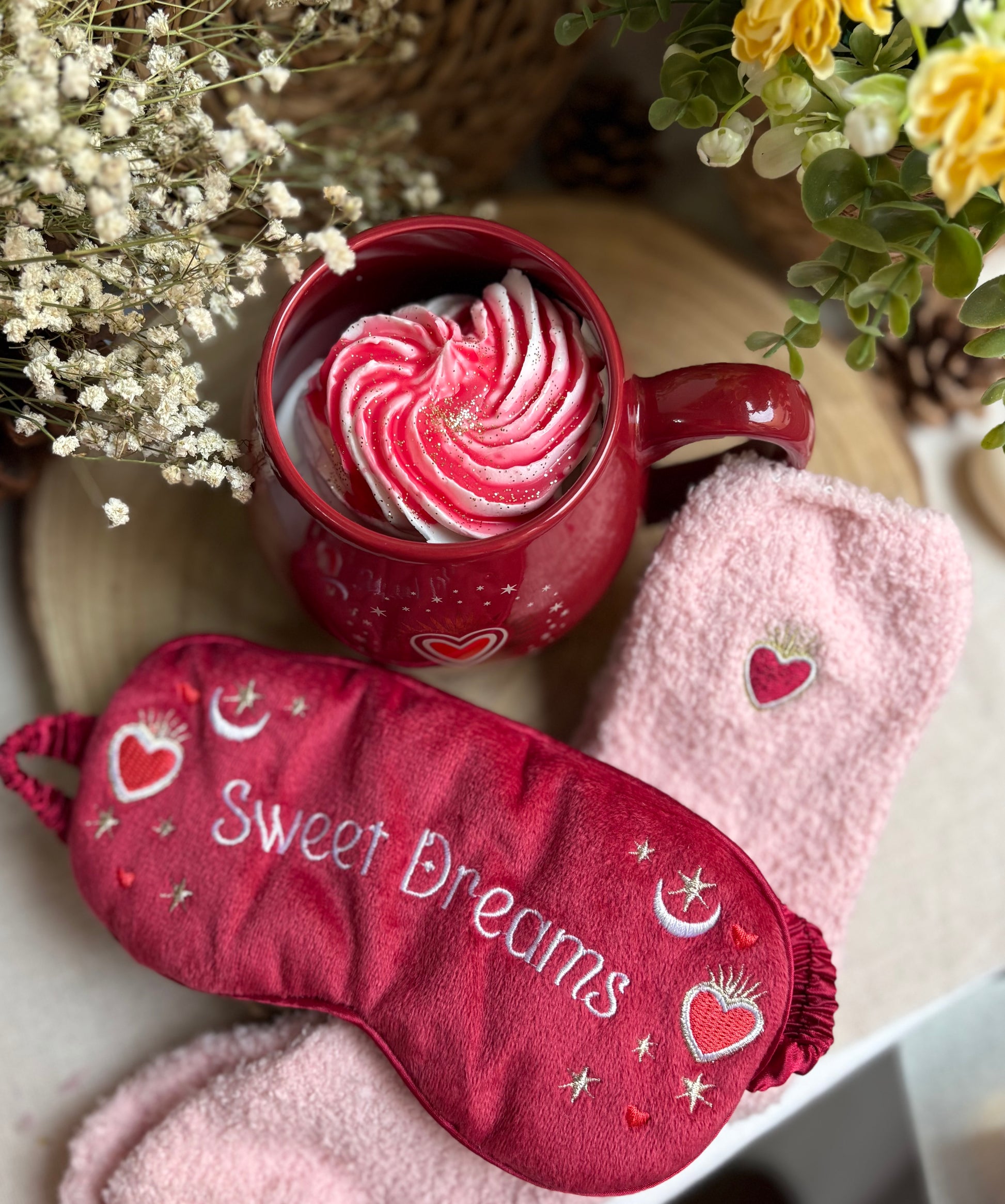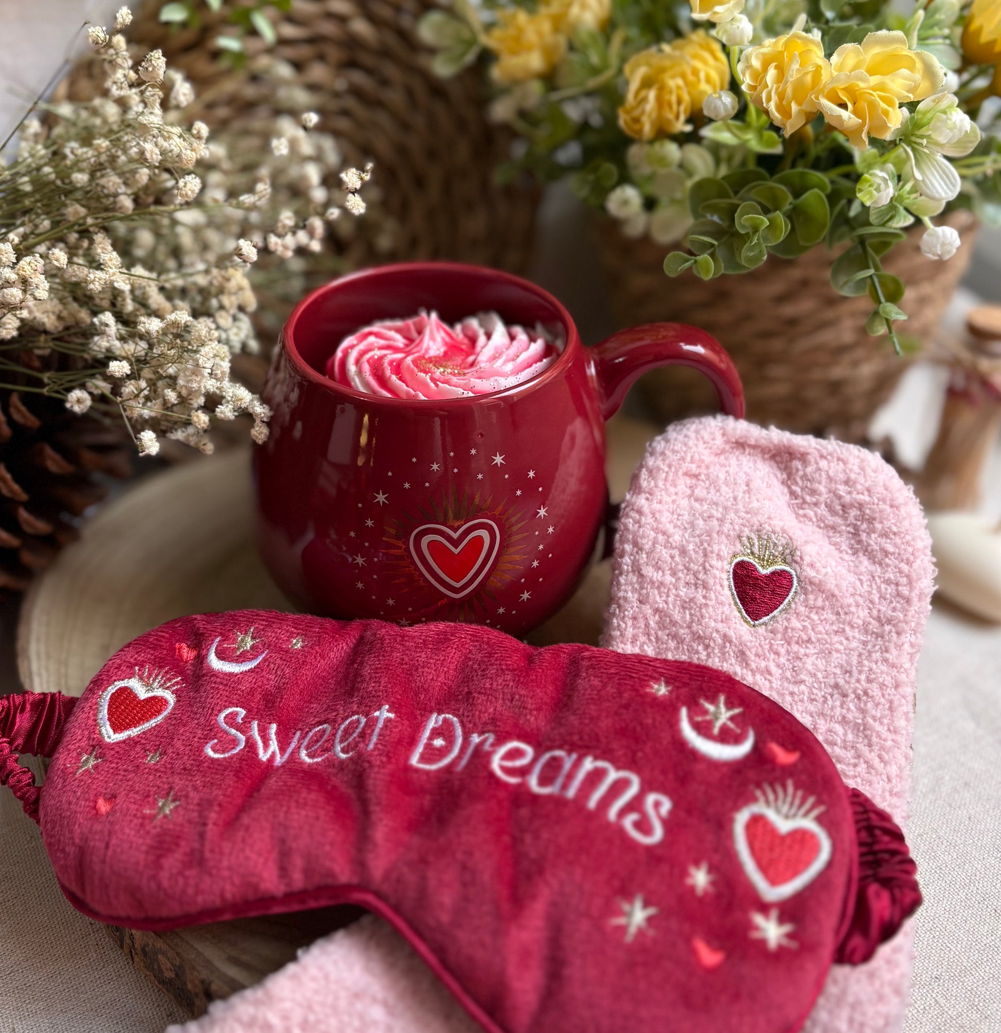 Para completar la experiencia, el pack incluye unos calcetines calentitos con un corazón bordado y una máscara para dormir de tejido suave, a juego con la taza, pensada para acompañarte en esos momentos de descanso profundo y autocuidado.