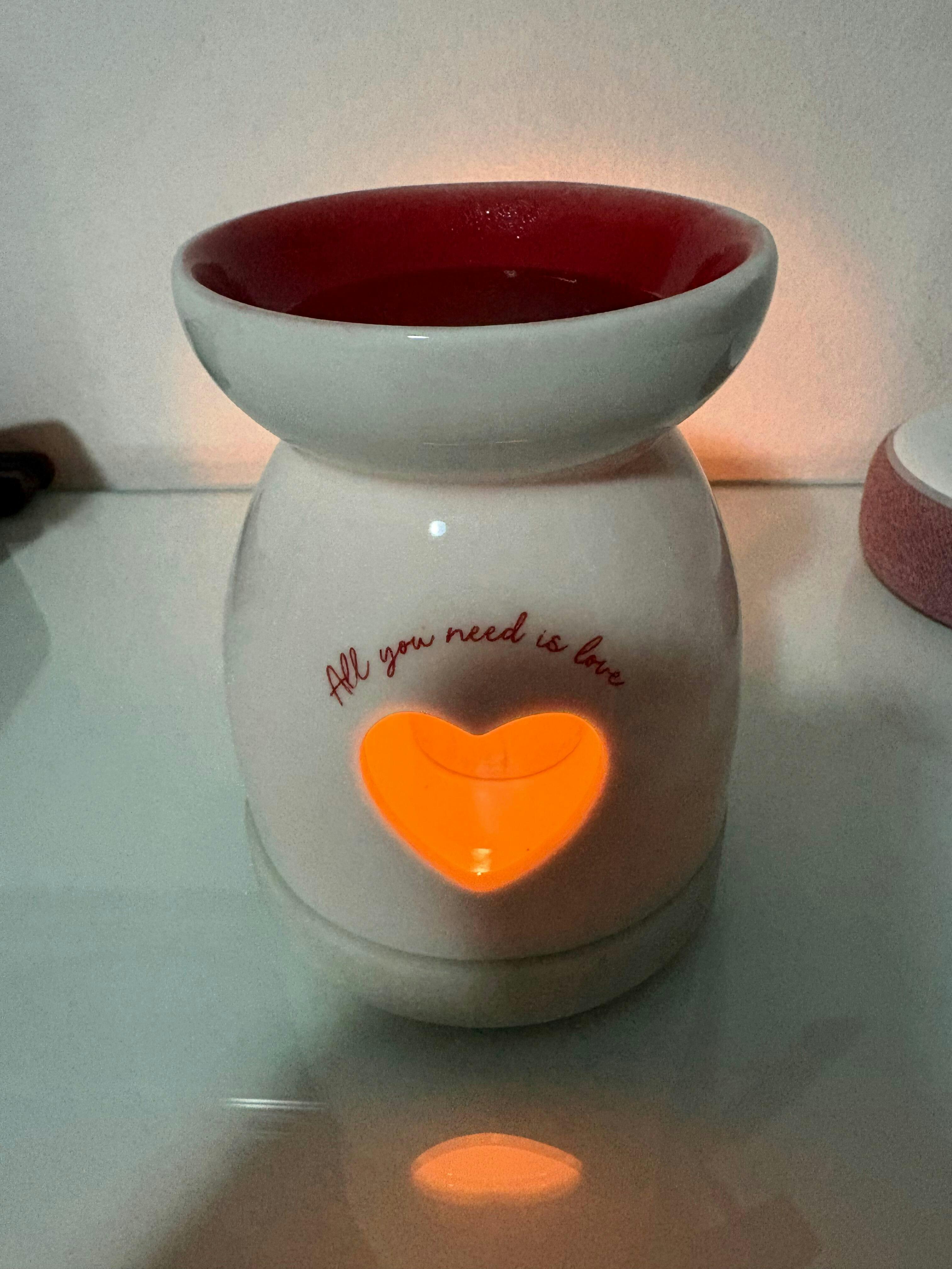 Disfruta derritiendo nuestros wax melts o figuras de cera aromáticas en este quemador de cerámica tan original, en el que verás la llama de la vela de té a través del corazón.