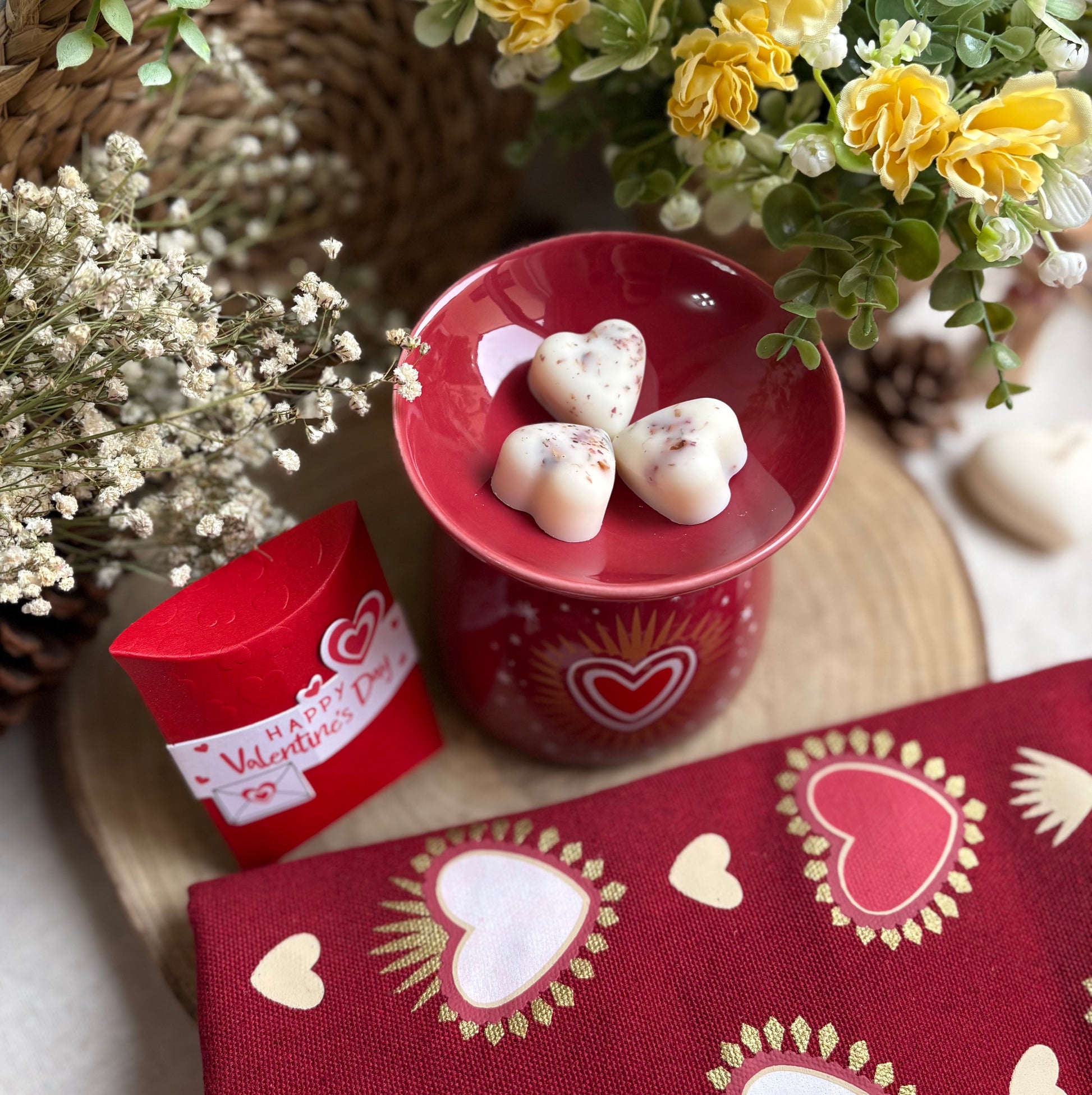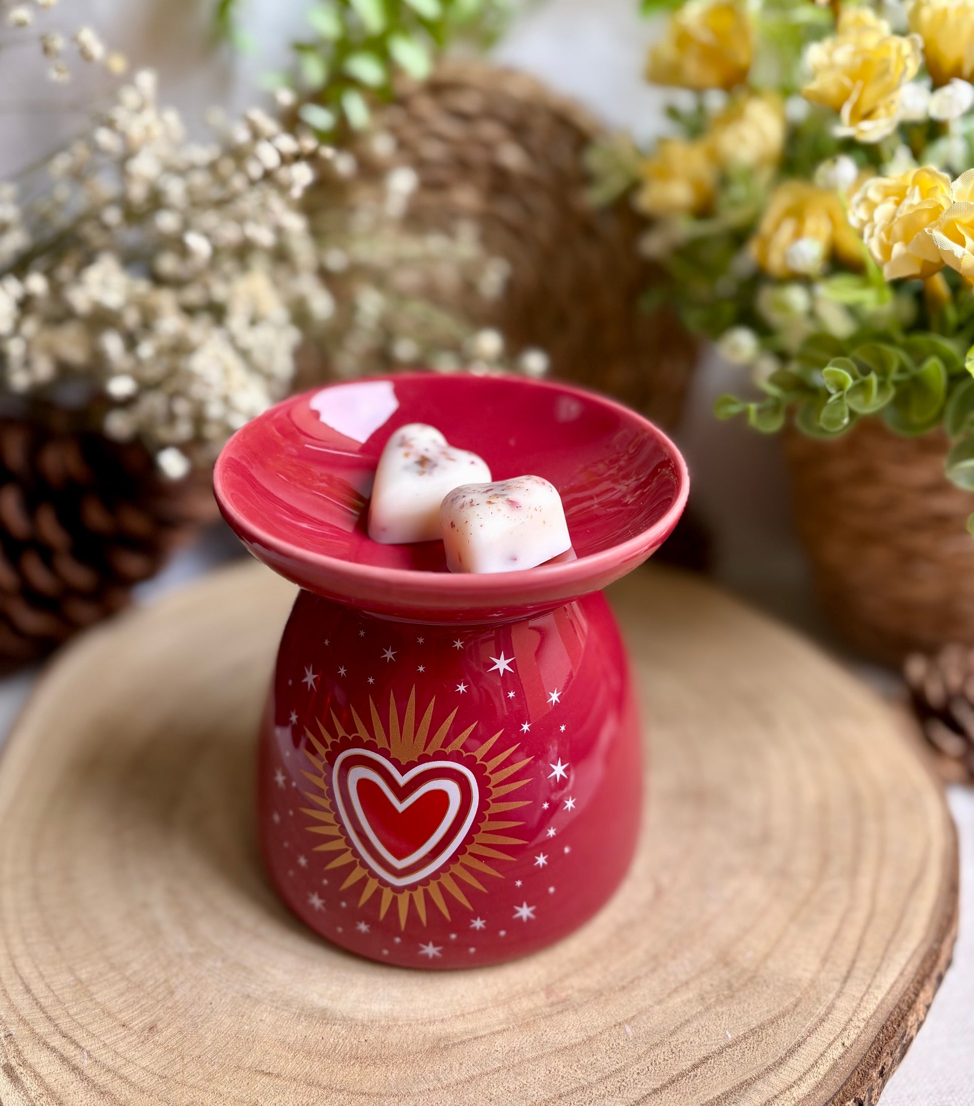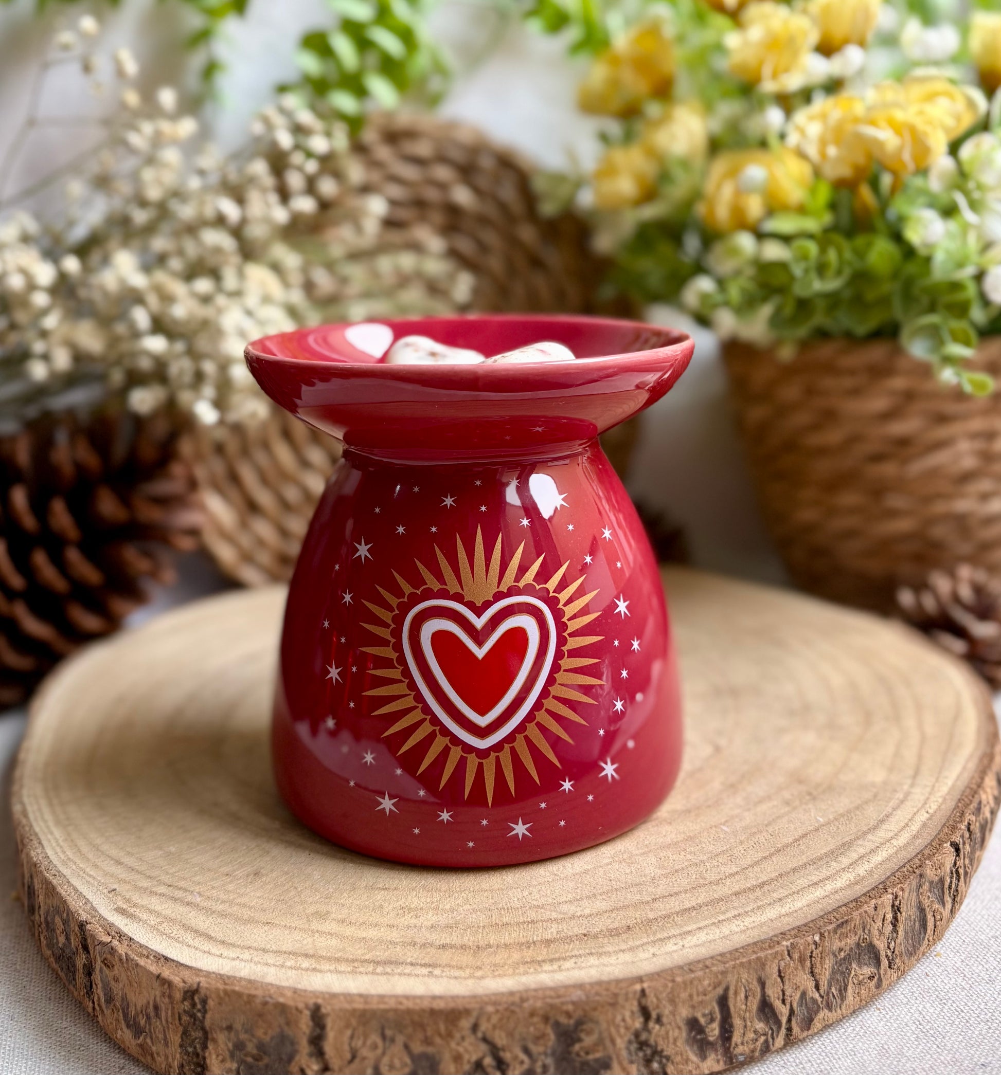 Disfruta derritiendo nuestros wax melts o figuras de cera aromáticas en este quemador de cerámica tan elegante de color granate ❤️. Además, puedes añadir una tote bag a juego con el quemador, llevándote de regalo un pack de 30 g de wax melts con aroma a rosa antigua.