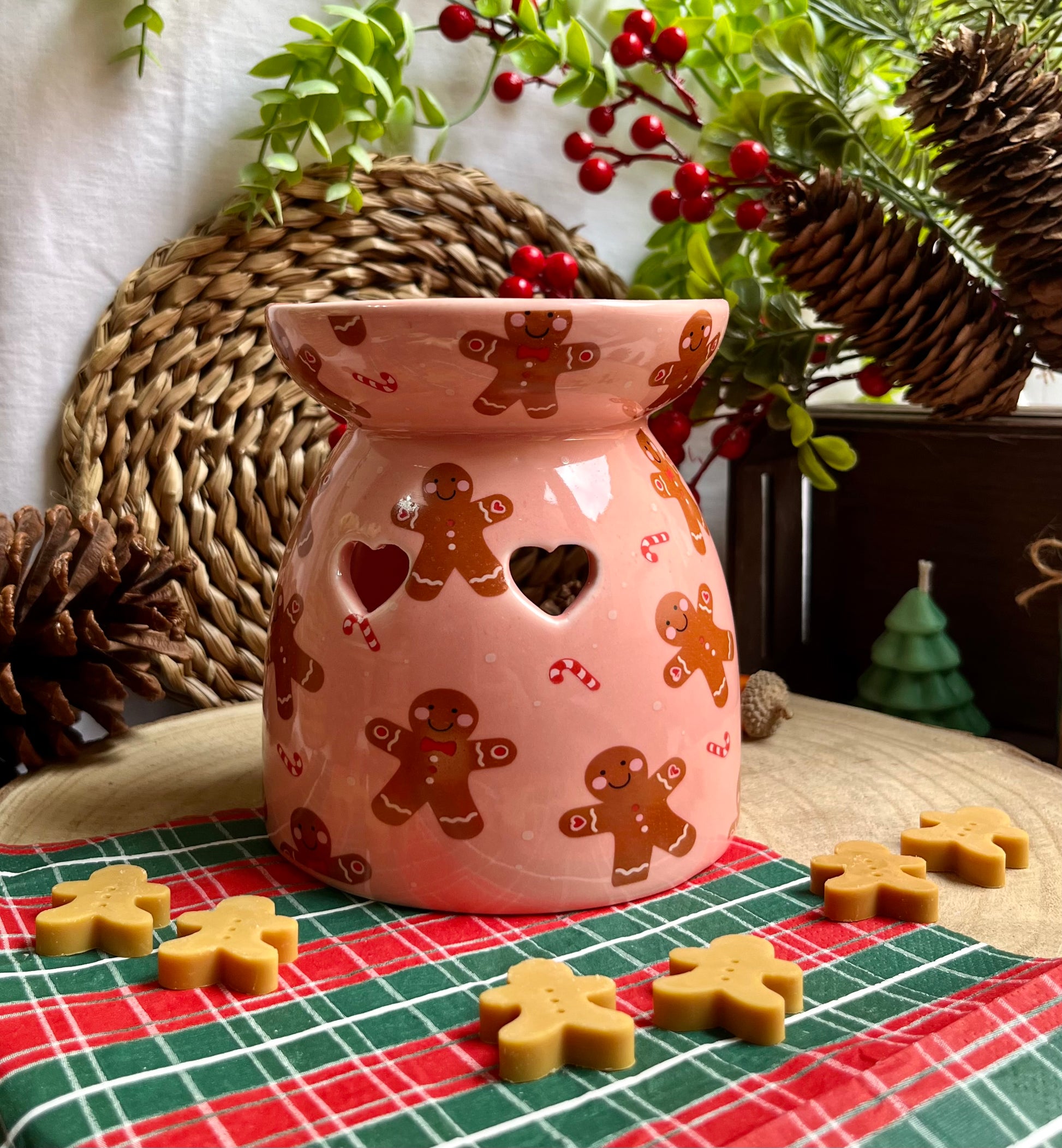 Disfruta derritiendo nuestros wax melts o figuras de cera aromáticas en este quemador de cerámica tan original con estampado navideño de muñecos de jengibre. 🍬